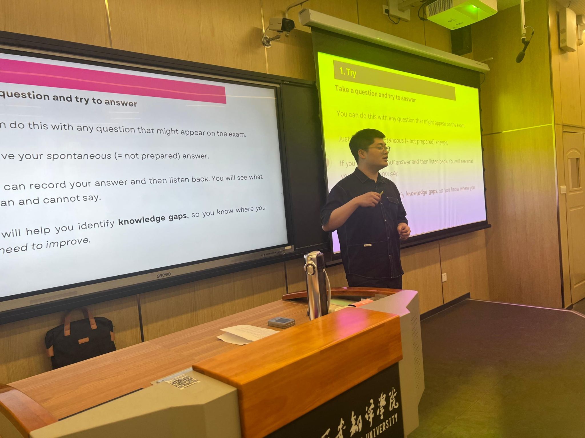 On April 16, Trainer Wang Qichao presented Sustained Progress in Listening & Speaking: From Foundational Practice to Advanced Expression. The workshop followed a three-level progression. Foundation: AI speech analysis addressed pronunciation gaps, while authentic scenarios (airport announcements, academic dialogues) sharpened listening accuracy. Breakthrough: Connected speech patterns (linking, reduction) were decoded to overcome comprehension barriers. Advanced Output: TED talk case studies demonstrated academic discourse frameworks, teaching students to structure arguments using the claim-evidence-example triangle. Wang stressed: “Precision in input determines excellence in output.”