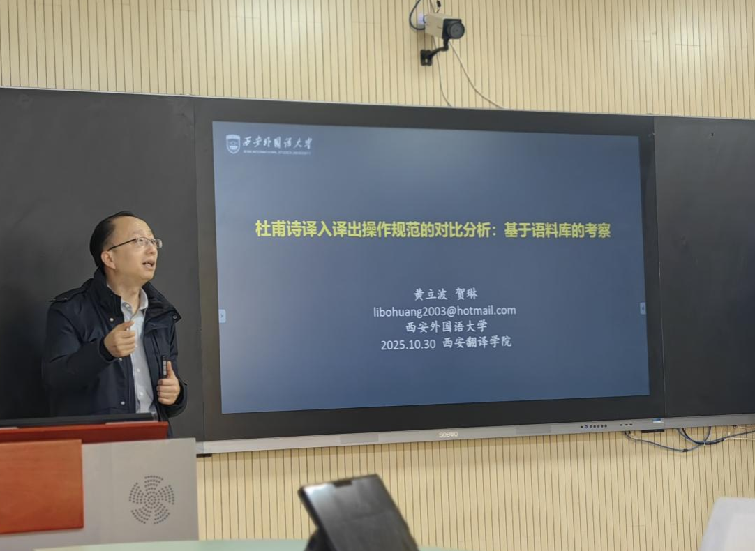 On the afternoon of October 30th, 2025, the 76th academic lecture of the “Zhongnan Cultural Translation Forum”, jointly organized by the Research Office of Xi’an Fanyi University, English School, and the Xi’an Translation Association, was successfully held. The lecture featured Professor Huang Libo, Vice President of Xi’an International Studies University, Dean of the Institute of Foreign Languages and Literature, and doctoral supervisor, as the keynote speaker. The topic of his presentation was “A Comparative Analysis of Operational Norms in Translating Du Fu's Poetry into and from Chinese: A Corpus-Based Investigation”. With profound academic expertise, Professor Huang delivered an academic feast of theoretical depth and practical value to the attending faculty, drawing on his solid academic foundation and extensive research experience.