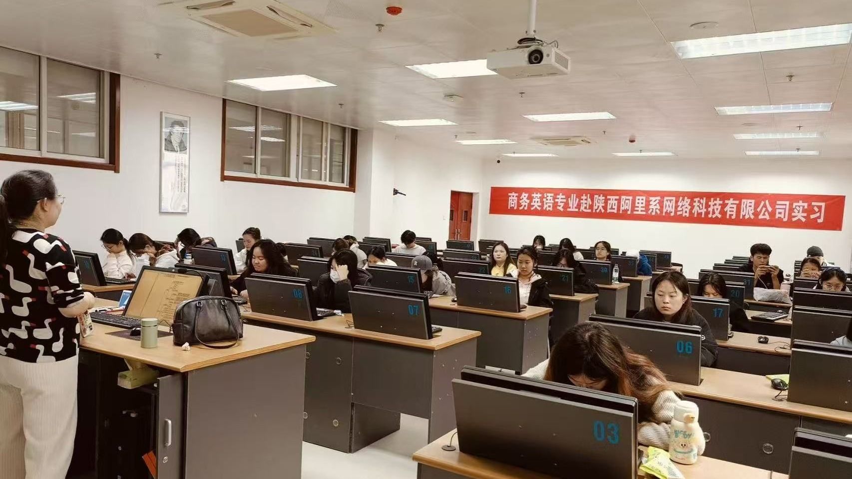 Teacher GaoYu, the person in charge of the internship, provided a detailed introduction to the corporate culture, business scope, and specific schedule during the internship of Shaanxi Alibaba-affiliated Network Technology Co., Ltd., with emphasis on safety precautions, corporate rules and regulations, and professional etiquette norms during the internship. Meanwhile, through clear sorting out, Teacher GaoYu defined the division of labor and contact information of on-campus and off-campus instructors for each day, and specially emphasized norms such as computer room electricity safety, online account confidentiality, and neat internship attire. Subsequently, Director WeiZheng of the Business English Practice Teaching and Research Section emphasized the importance of the internship in combination with the development trends of the cross-border e-commerce industry and the professional characteristics of students. He mentioned that this internship, cooperating with Shaanxi Alibaba-affiliated Network Technology Co., Ltd., can provide real back-end operation permissions of Alibaba International Station and TikTok live broadcast scenarios, which is a key opportunity for students to transform their Business English knowledge into “practical capabilities.” He urged everyone to abide by the internship discipline, take the initiative to consult about practical operation problems, and cherish the transition opportunity “from textbooks to business.” Finally, Director Zhang Guojian of the Business English Department made a concluding speech. From the perspective of “career development,” he put forward requirements for the students: first, focus on skill improvement, focusing on mastering core capabilities such as English product listing, cross-border customer service communication, and live broadcast script writing to form practical achievements that can be used for job hunting; second, pay attention to team cooperation, especially in the group live broadcast practice in the second week, give full play to their respective advantages and complement each other; third, do a good job in internship summary, sort out problems and gains in a timely manner, and transform the internship experience into competitiveness for future employment.